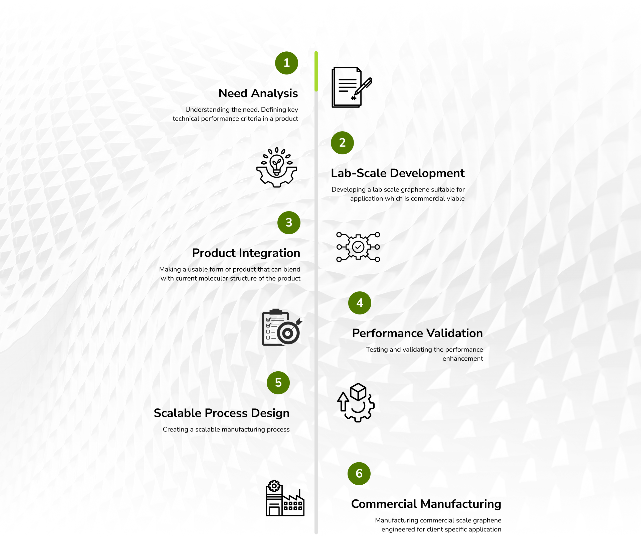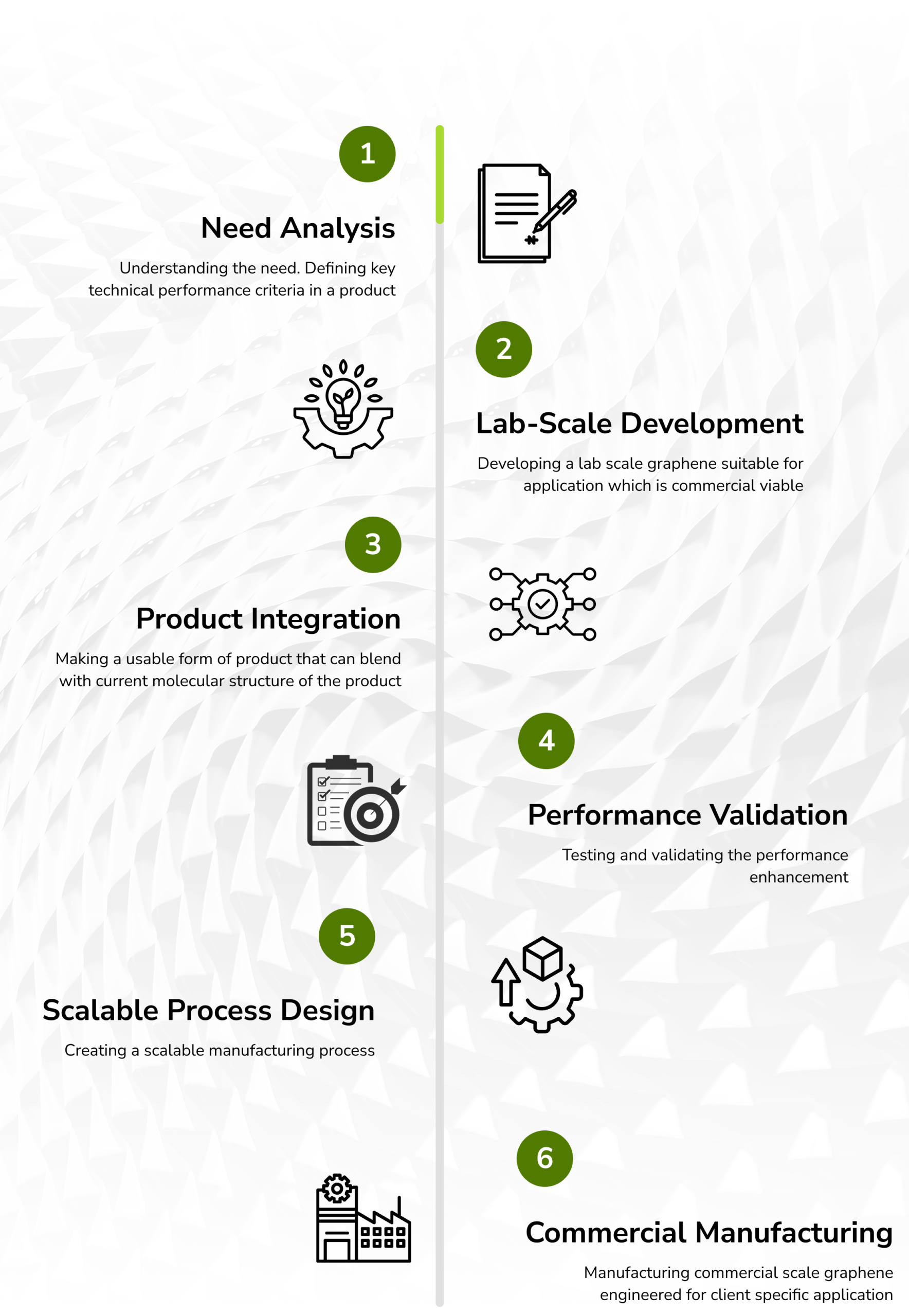 To create commercially viable graphene solution for industrial applications. Develop, validate and make commercial scale manufacturing of graphene Innovations to provide a clean air, clean water, clean energy and better life.